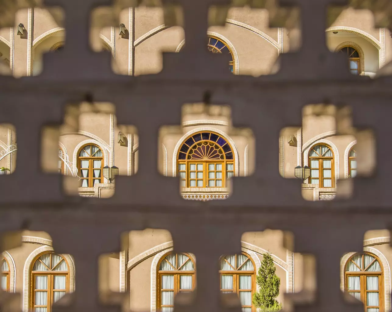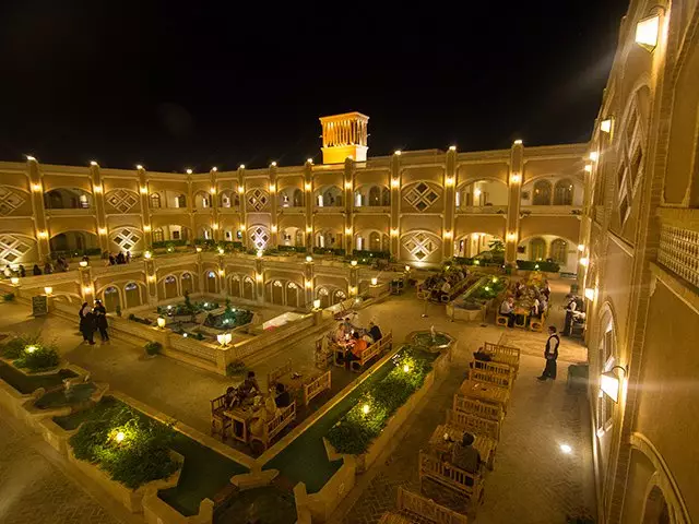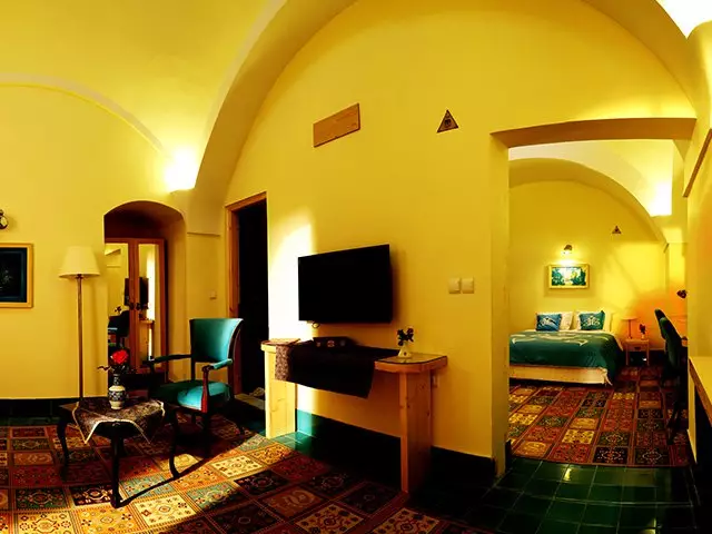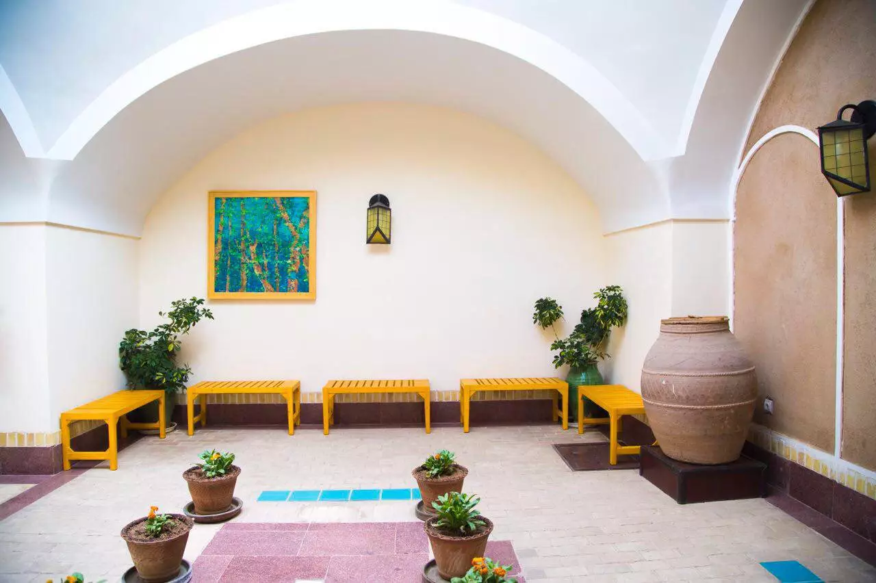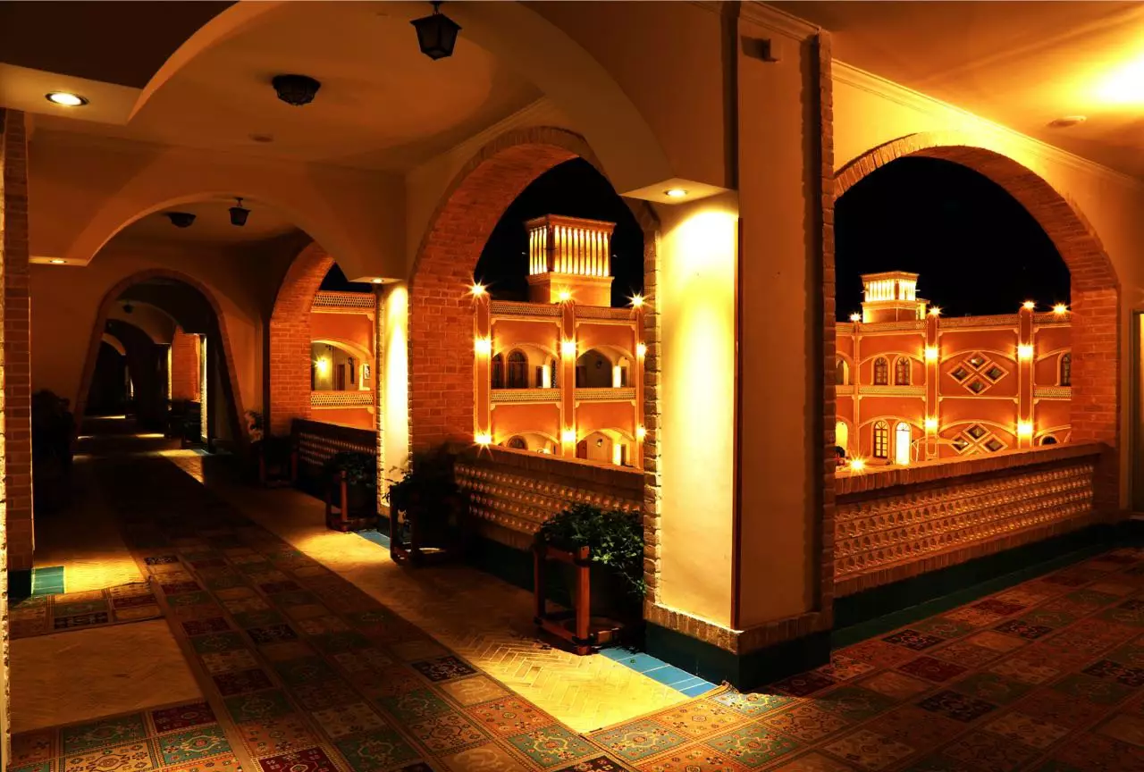 فضای داخلی هتل حس تاریخی و سنتی خیلی قوی دارد؛ نورگیری طبیعی، طاق و قوسهای سنتی، استفاده از مصالح بومی مثل آجر و کاهگل