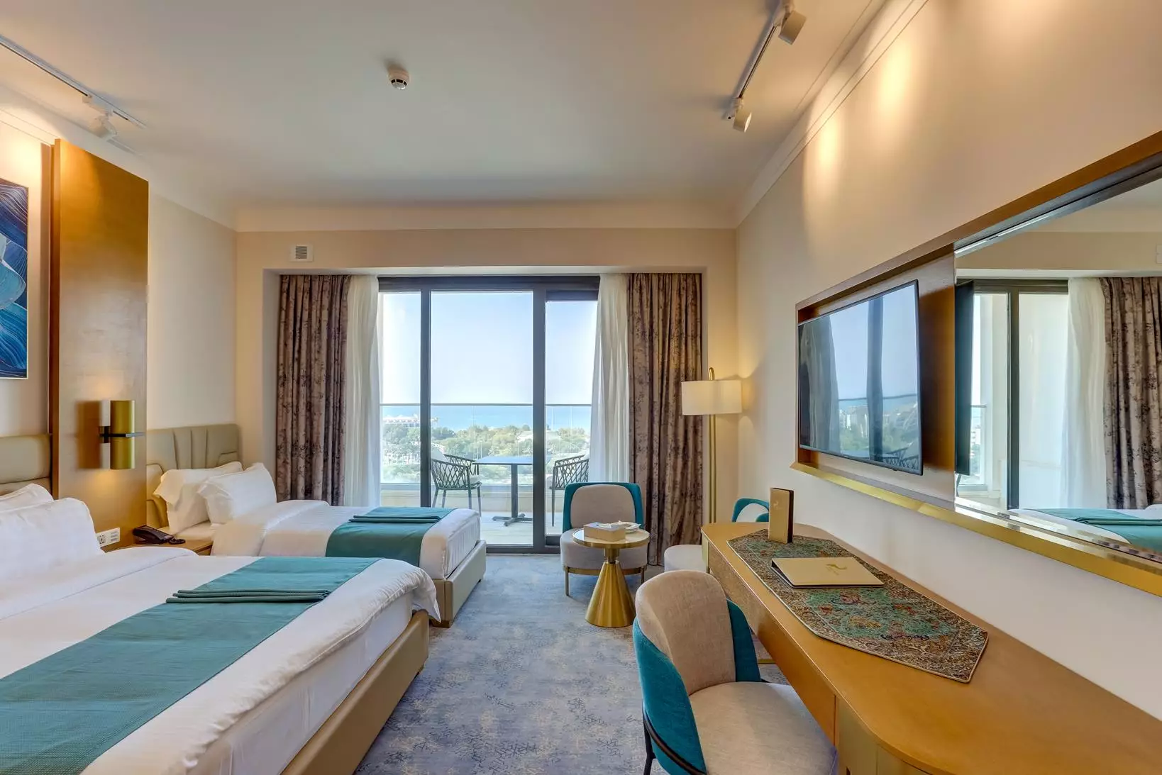 امکانات: تخت دونفره بزرگ، بالکن با نمای دریا، تلویزیون، اینترنت، یخچال، حمام لوکس.