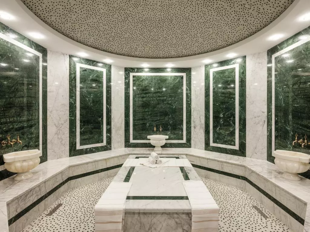 • حمام مرمرین با دوش بارانی و لوازم بهداشتی لوکس