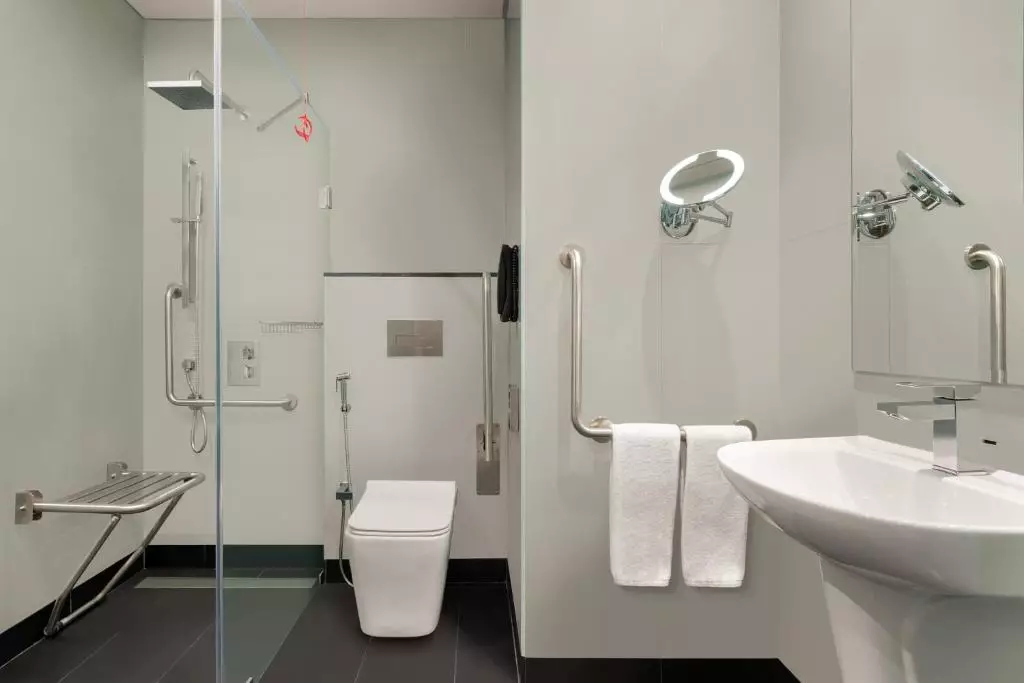 حمام اختصاصی با دوش، لوازم بهداشتی پایه، حوله و دمپایی