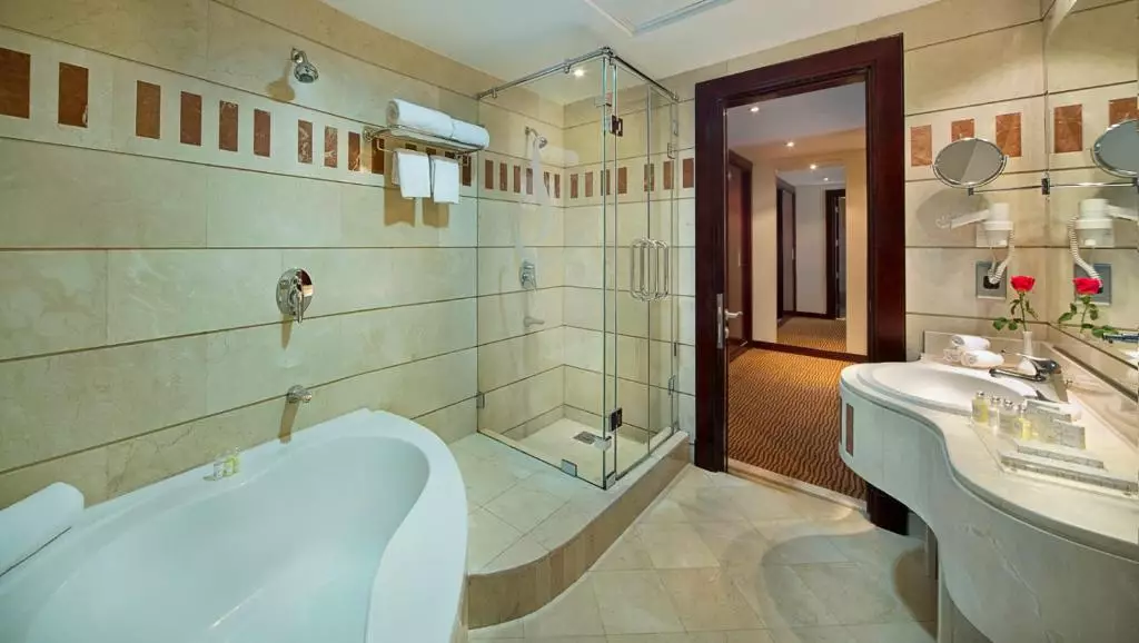 حمام اختصاصی با دوش یا وان، لوازم بهداشتی، حوله و دمپایی