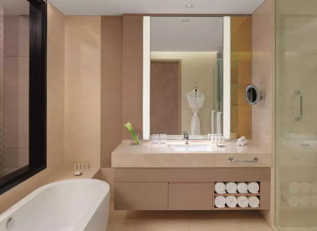 حمام لوکس با دوش بارانی، وان یا دوش جداگانه، لوازم بهداشتی با کیفیت، حوله، دمپایی
