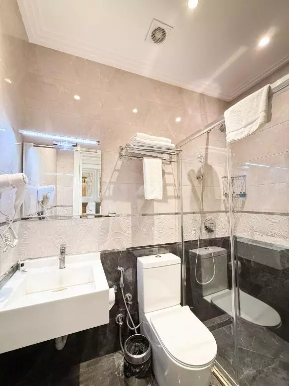 حمام اختصاصی مجهز به دوش، لوازم بهداشتی، حوله و سشوار